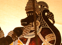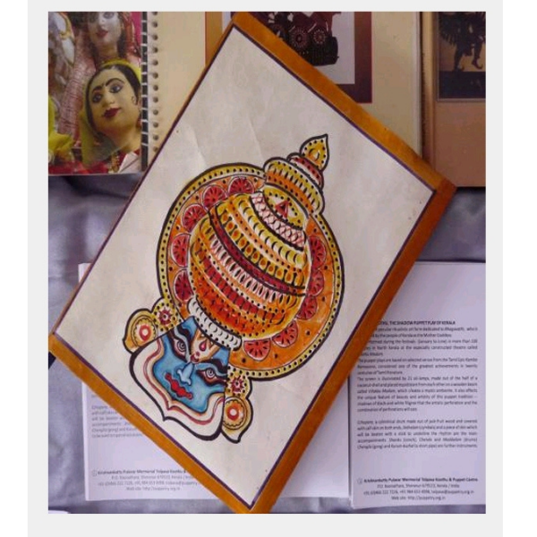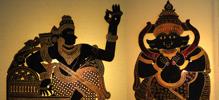 Tholpavakoothu puppets are made of deerskin. The figures are drawn on the skin, cut out and embellished with dots lines and holes, When the skin is completely dehumidified all the hair on its removed by scraping the surface with a sharp –edged piece of bamboo
